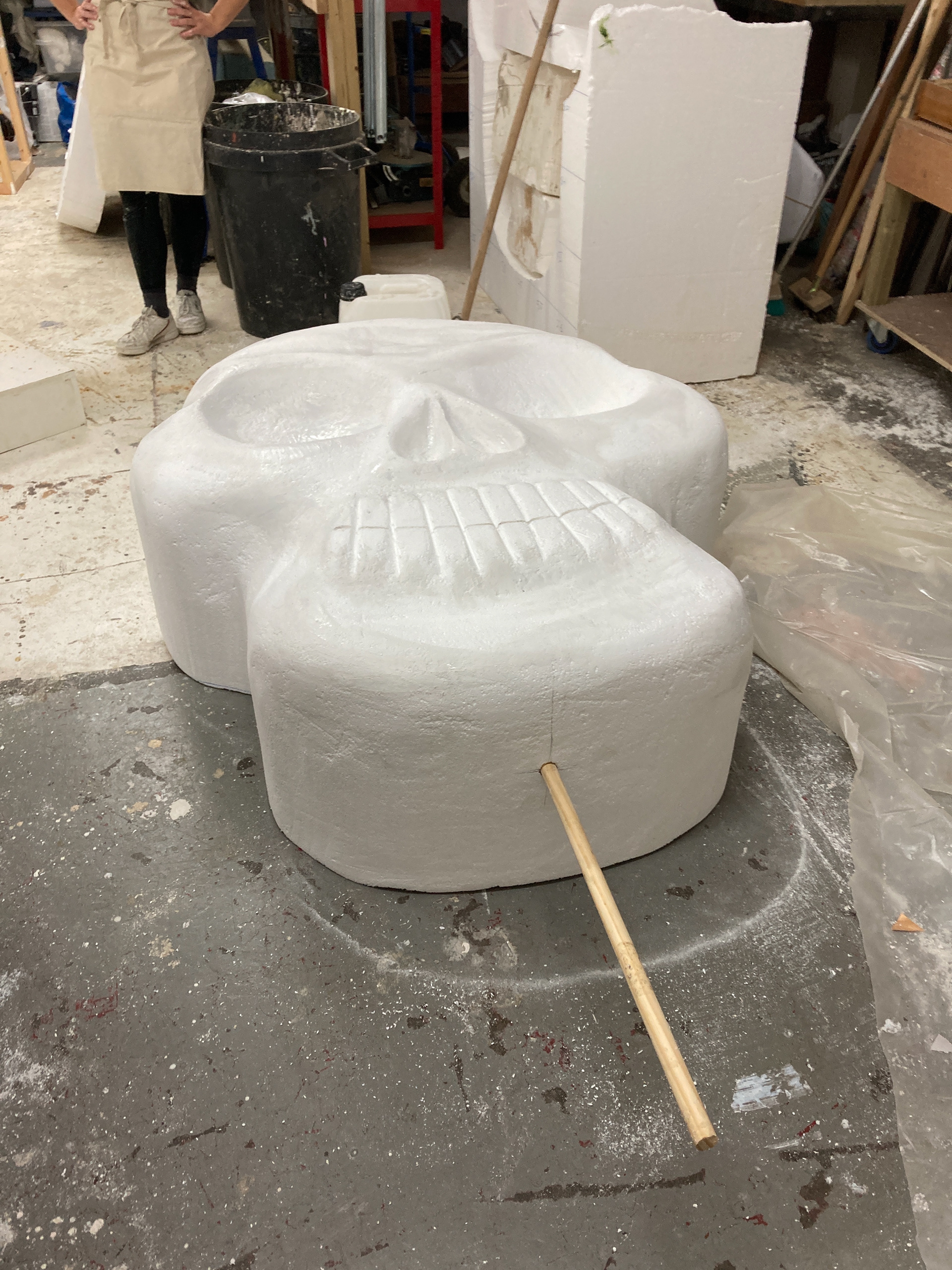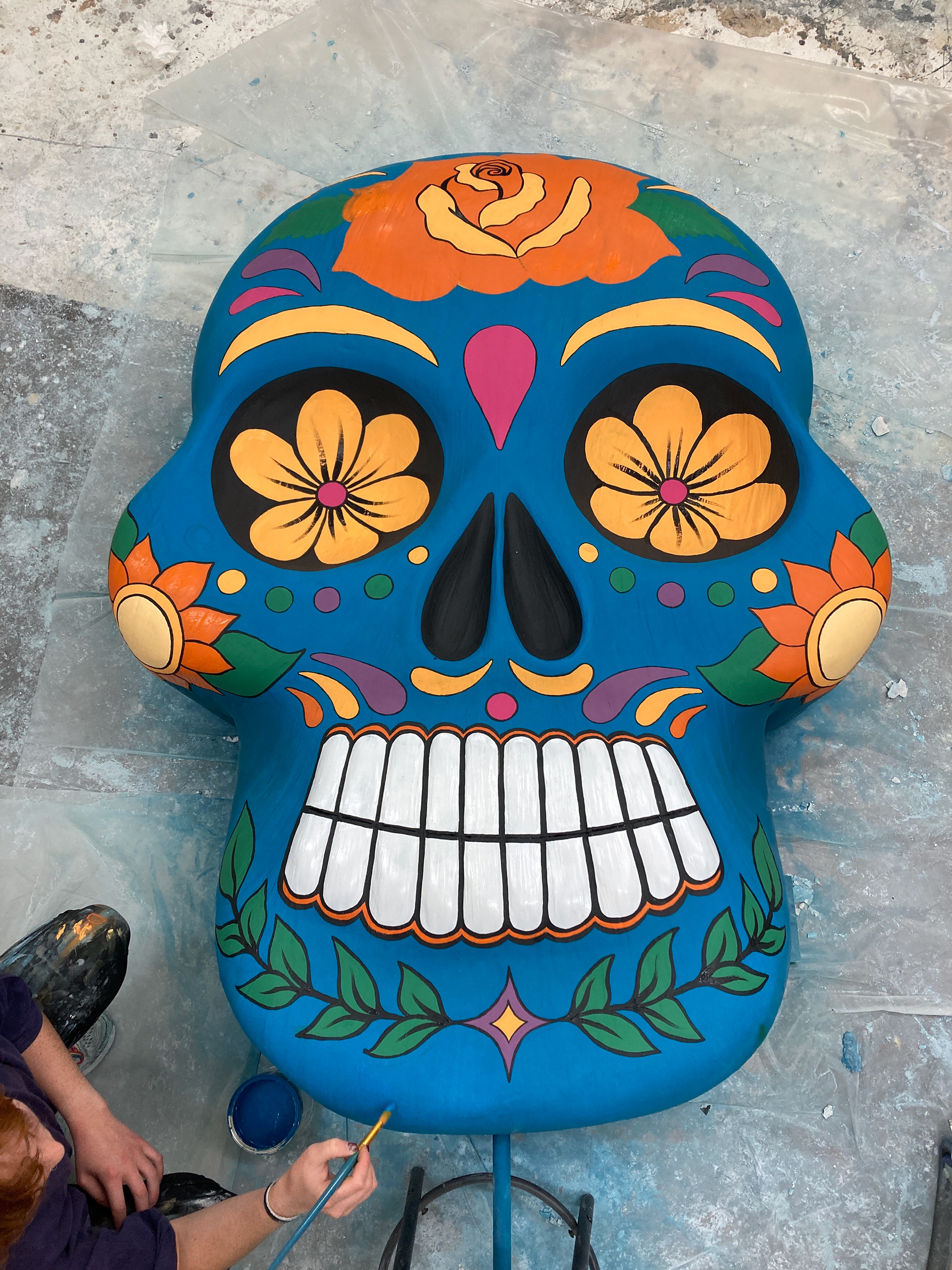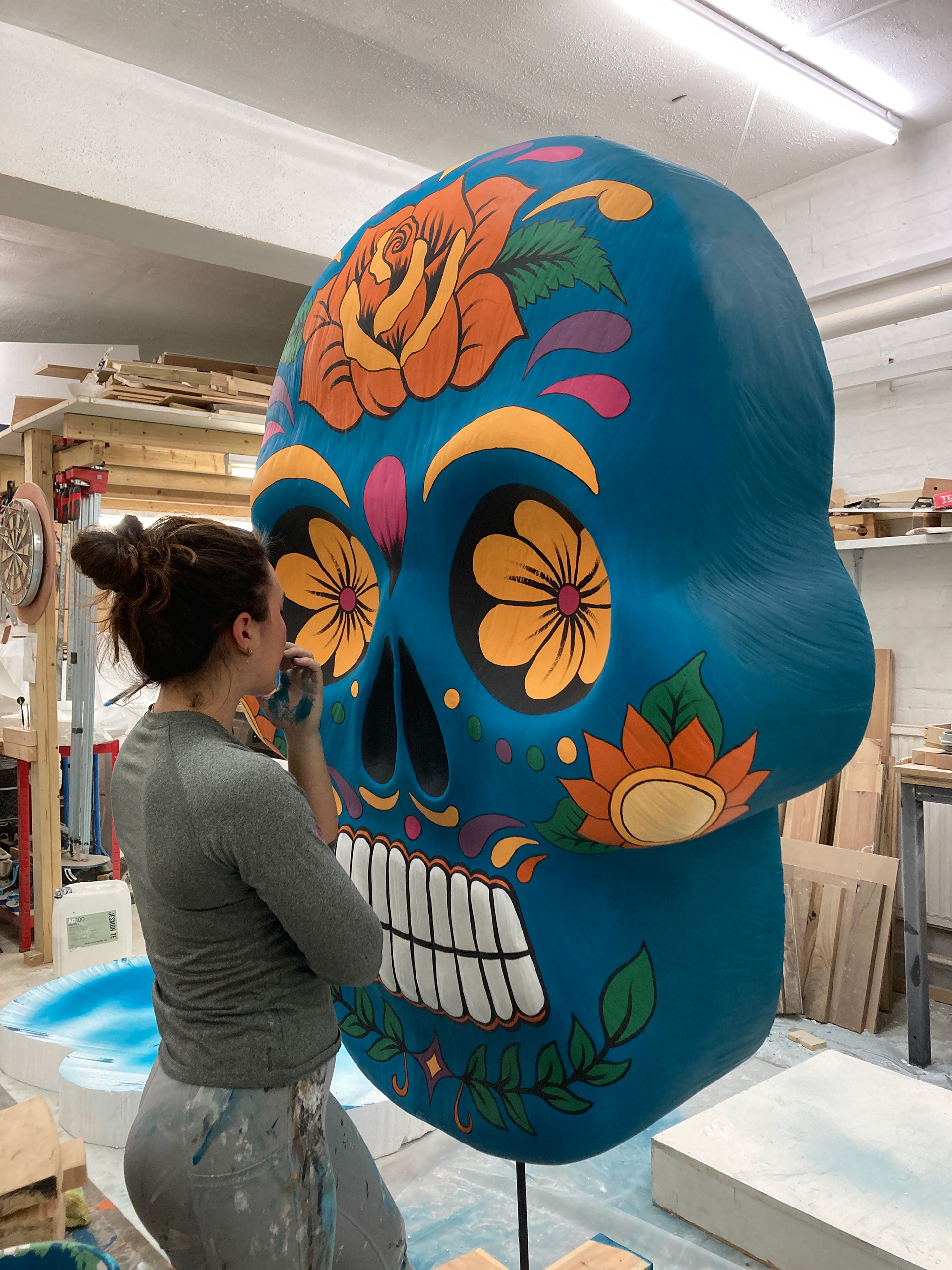 Located in Kings Cross Coal drops yard, Granary Square wanted an eye-catching three metre tall Day of the Dead themed skull. This commission was made start to finish in three days..